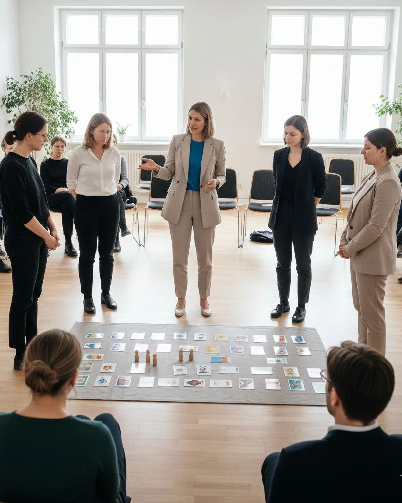 • Cuando una persona plantea su tema, se abre un trabajo en el campo similar a las constelaciones, pero con una diferencia clave: aquí la finalidad no es mostrar la dinámica, sino cerrar y desbloquear el conflicto desde la raíz. No se representa para observar, se interviene para reorganizar.
